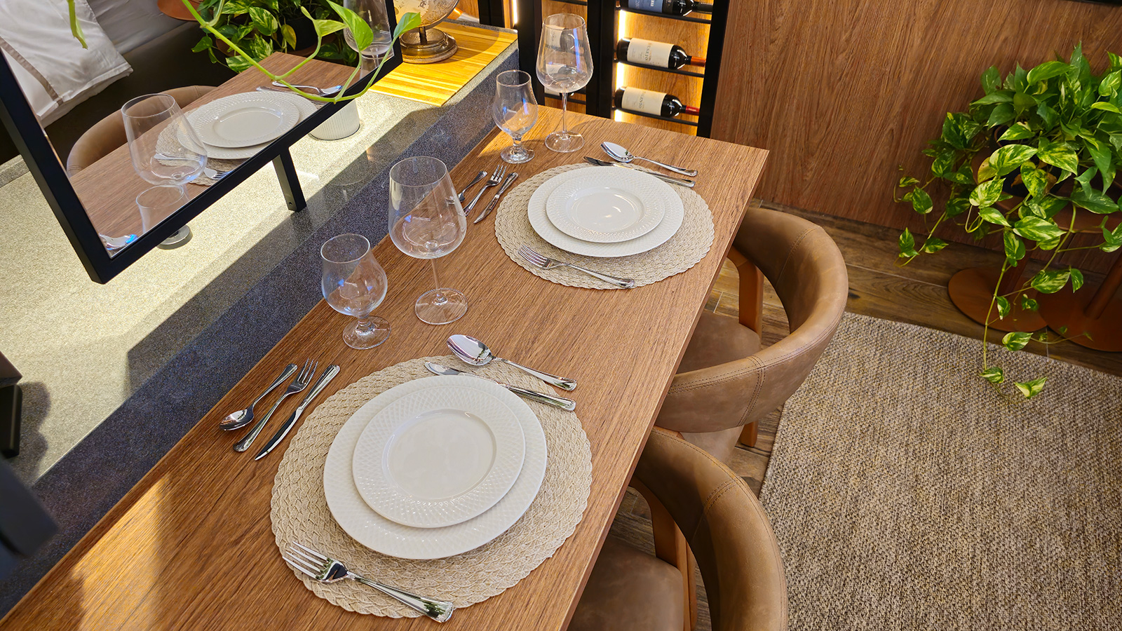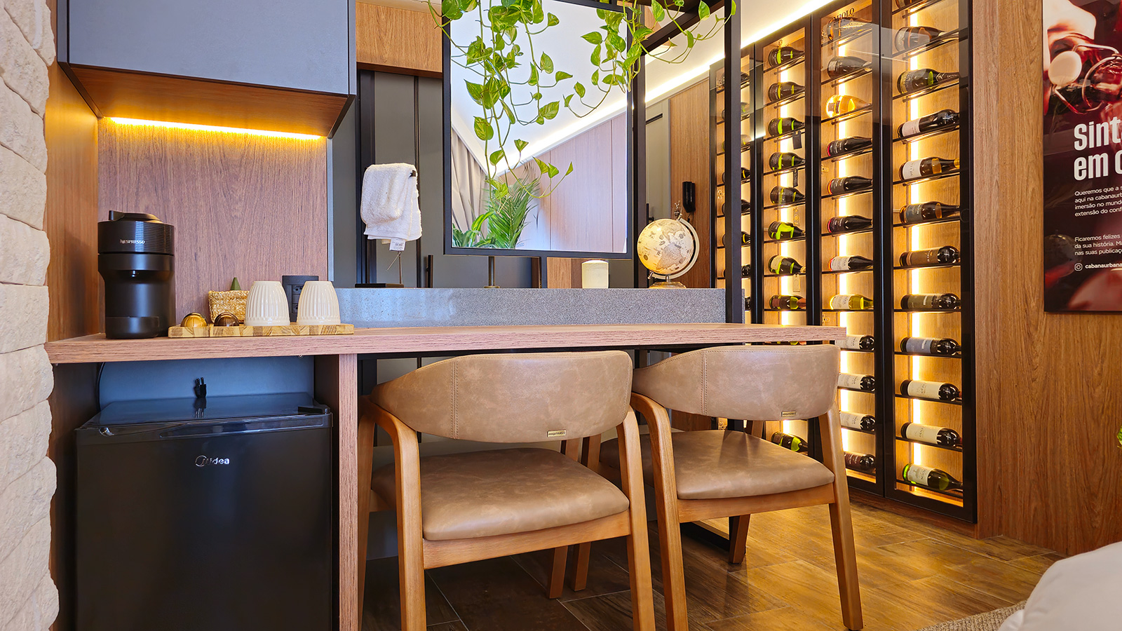Tudo na cabana urbana foi estudado para gerar uma experiência exclusiva de bem estar e aconchego, dentro da cidade, desde os materias, as cores, a iluminação indireta, a experiência do vinho com uma adega de 56 rótulos, a banheira de imersão, a lareira, as formas e revestimentos.